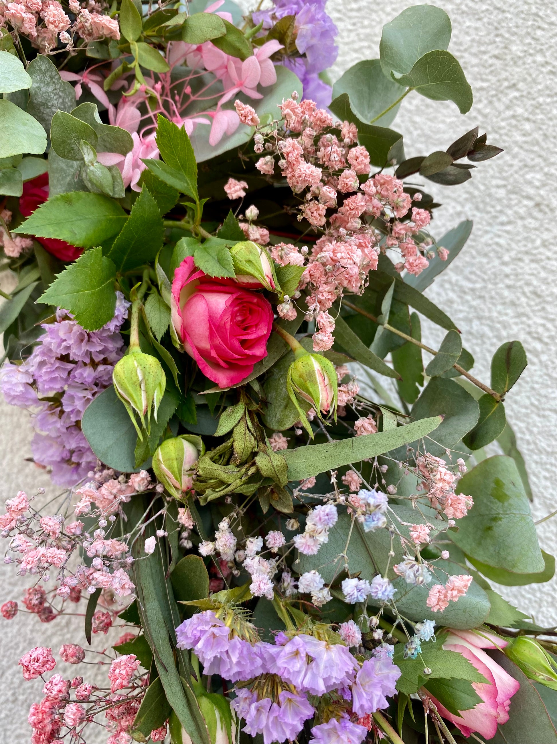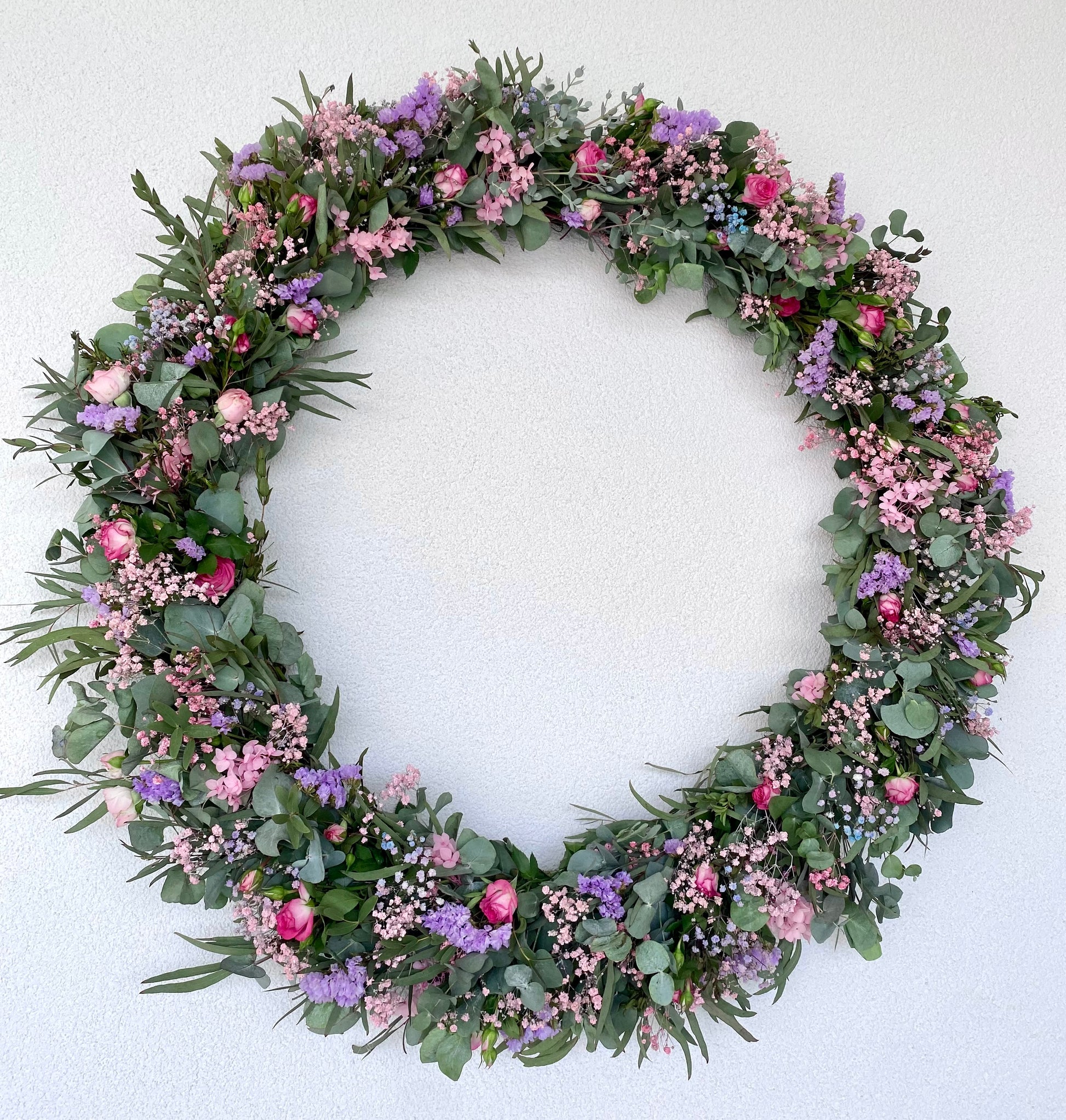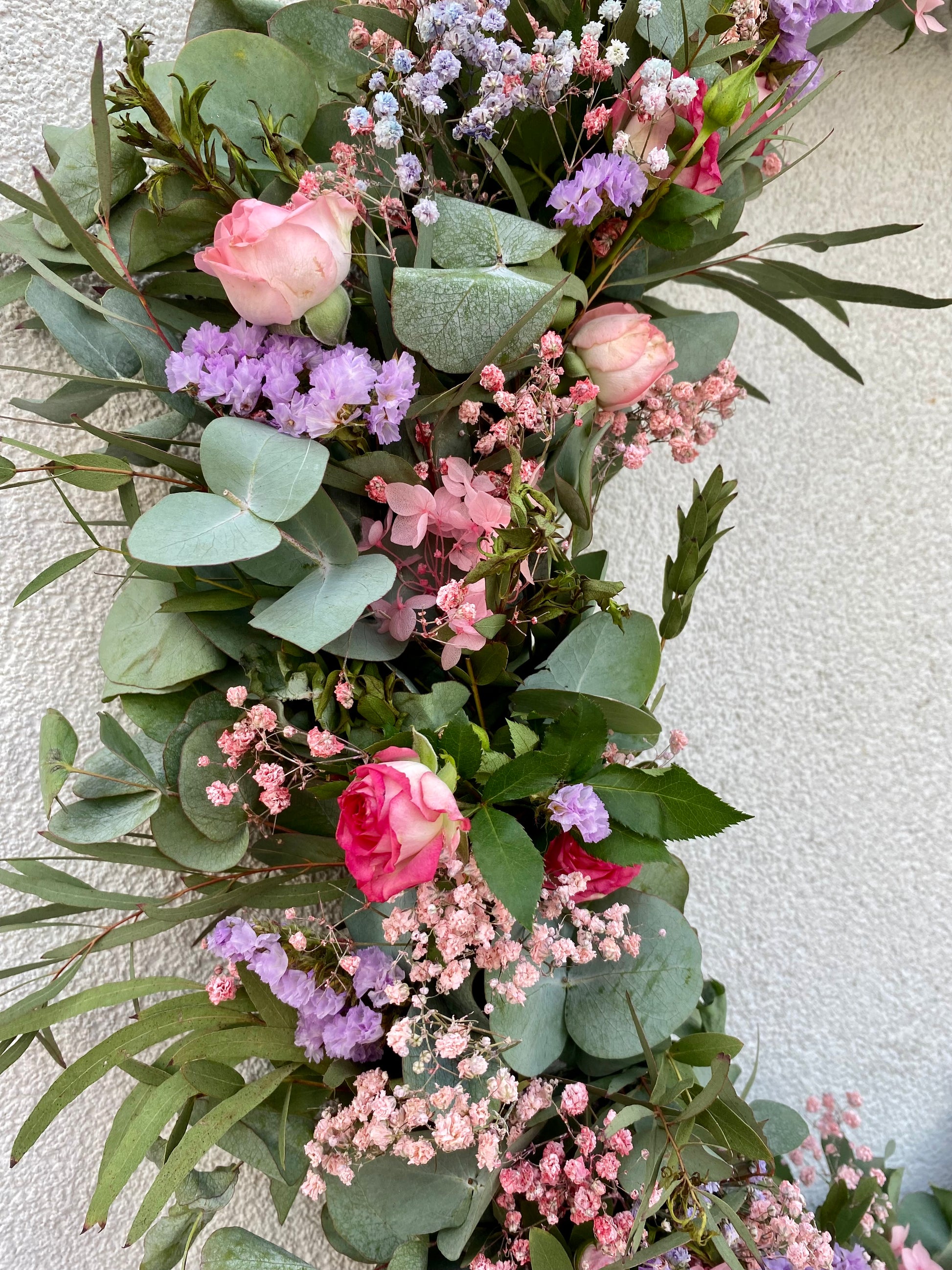 Přineste si domů kouzlo léta! Tento velký věnec je ideální pro zavěšení na dveře, na zeď, nad krb nebo jako středobod stolu na vaší letní hostině. Je vyrobený z přírodních materiálů - více druhů eukalyptu, růžičky, statice, gypsofila, hortenzie.