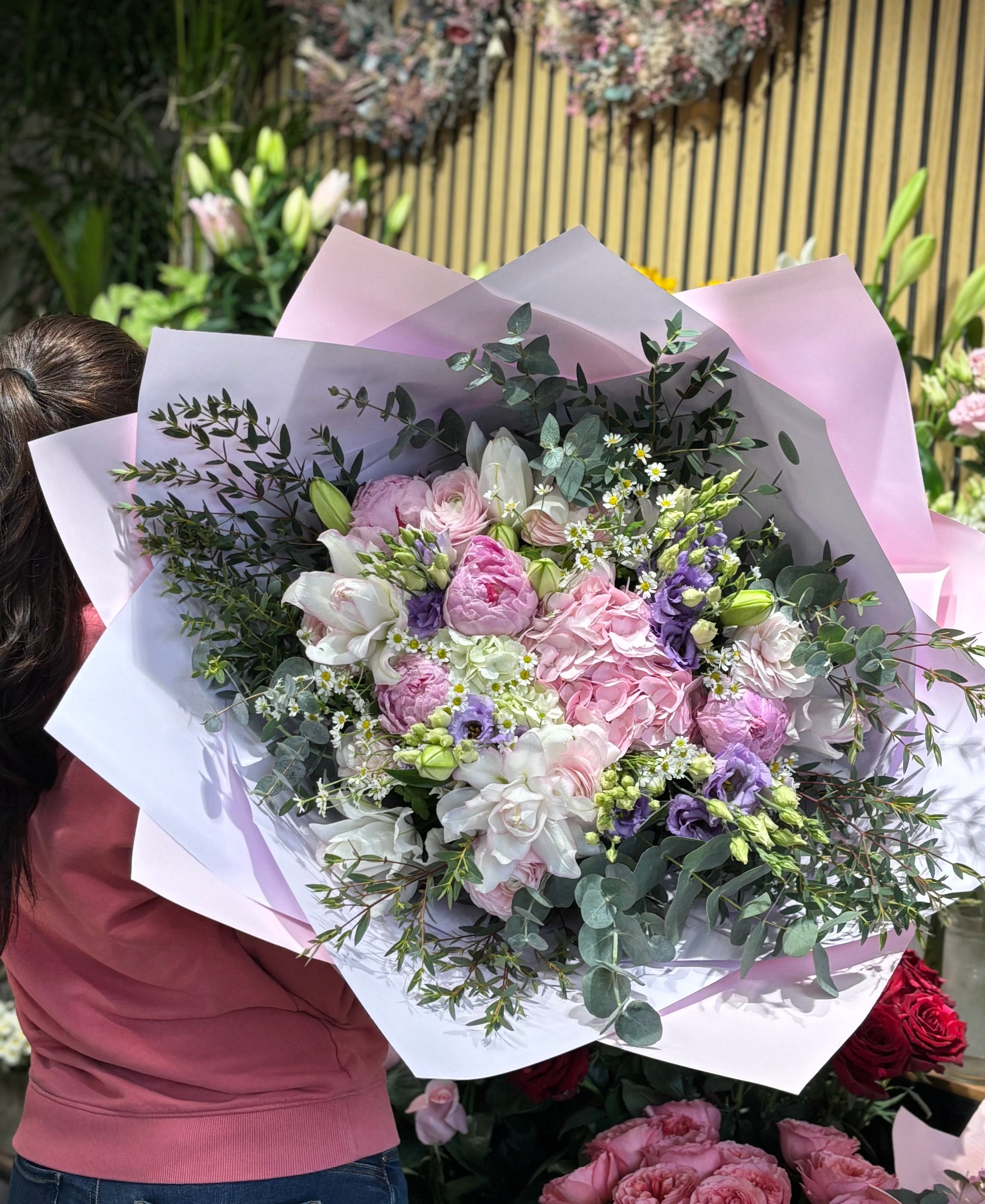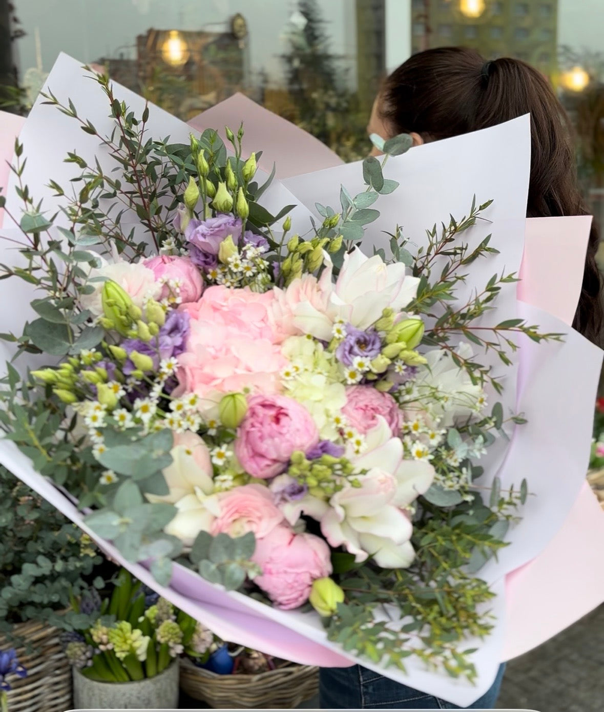 Luxusní kytice z plnokvětých lilií, pivoněk, ranunculusů